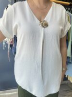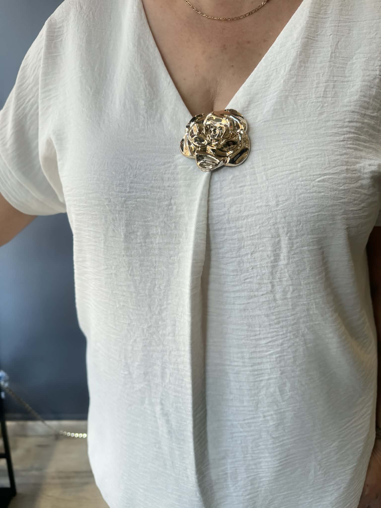 Αέρινη μπλούζα με λαιμόκοψη V που αναδεικνύεται από μια εντυπωσιακή χρυσή καρφίτσα σε σχήμα τριαντάφυλλου. Η κεντρική πτύχωση δίνει κίνηση στο ρούχο, καθιστώντας το μια safe αλλά ιδιαίτερη επιλογή για επίσημες ή casual εμφανίσεις.