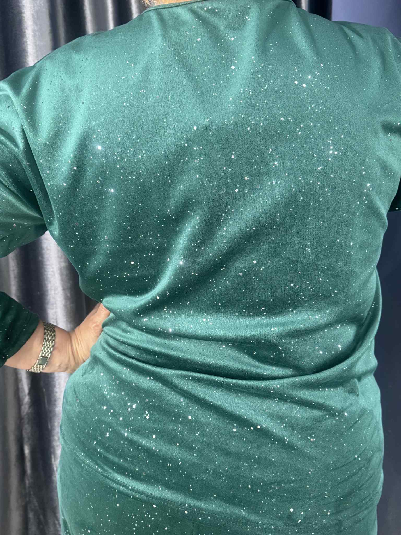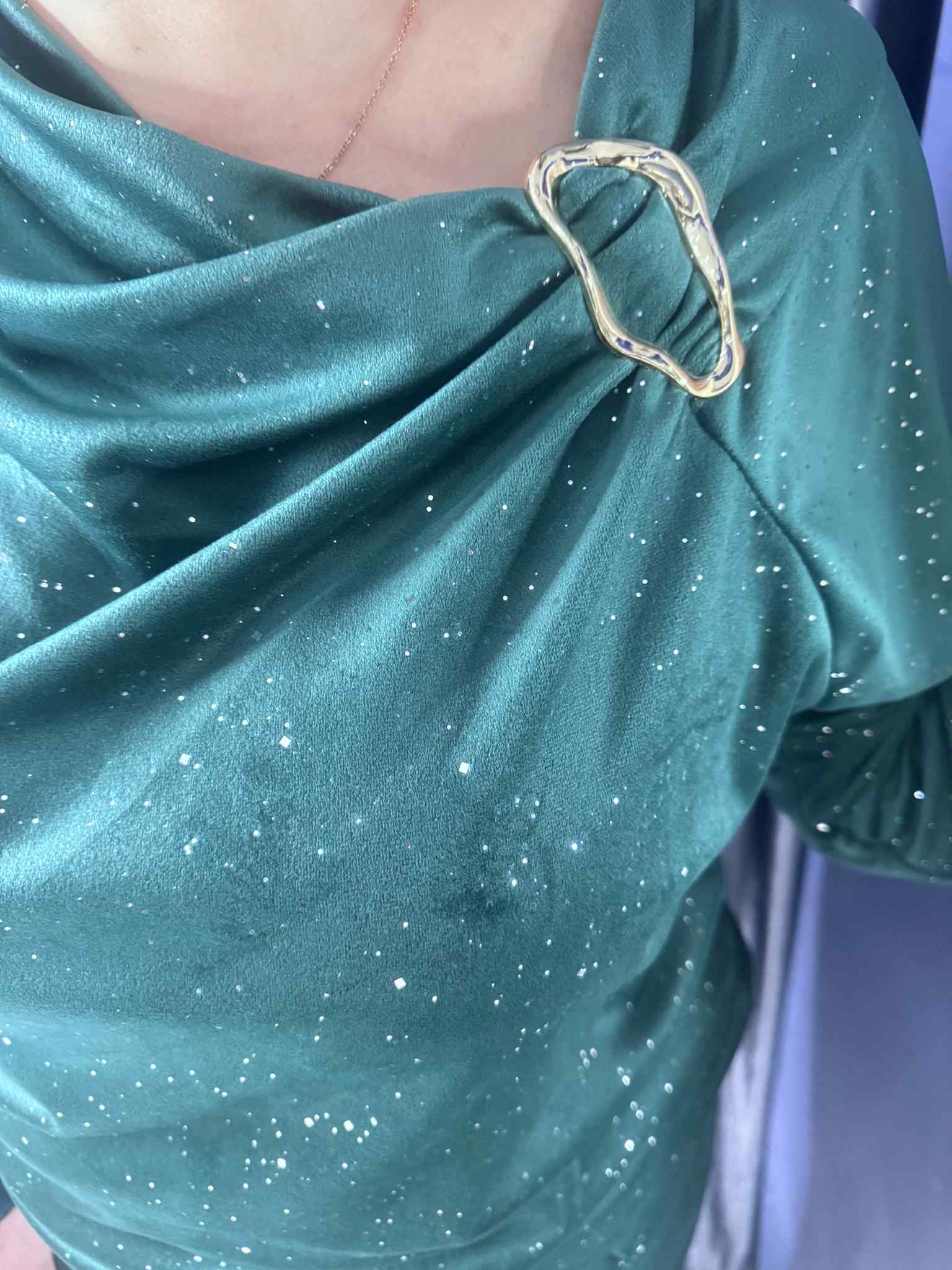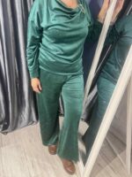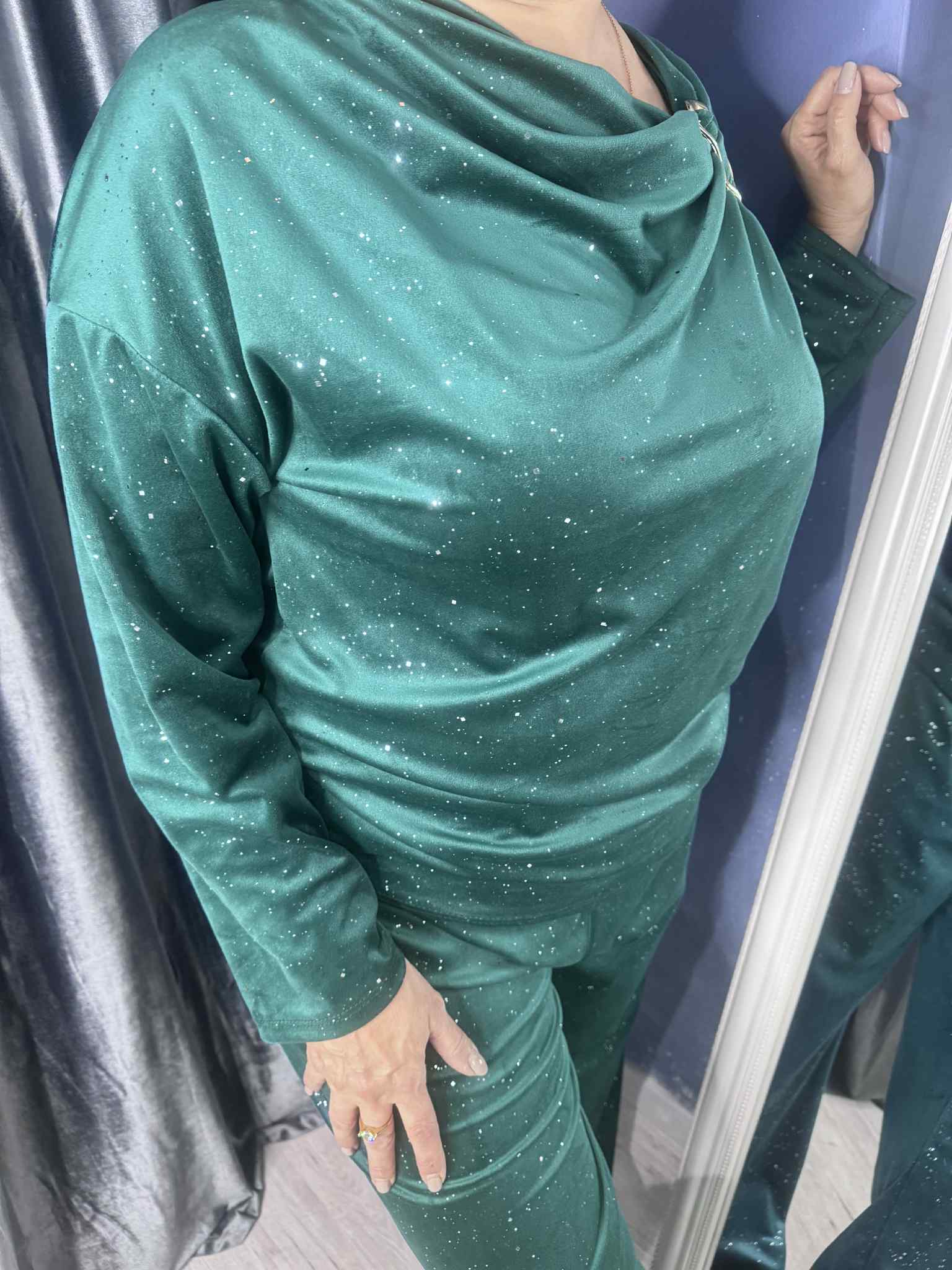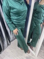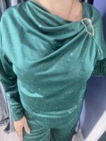 Κομψό σετ από απαλή, ελαστική βελούδινη ύφανση σε βαθύ σμαραγδί/μαυρο/σκουρο μπλε χρώμα, διακοσμημένο με διακριτικές λαμπερές κρυσταλλικές πινελιές που χαρίζουν εντυπωσιακή αλλά εκλεπτυσμένη λάμψη. Η μπλούζα διαθέτει χαλαρή γραμμή, μακρύ μανίκι και ιδιαίτερη λεπτομέρεια στον ώμο με χρυσή αγκράφα, προσθέτοντας μια elegant πινελιά. Το παντελόνι έχει άνετη εφαρμογή και ίσια γραμμή, προσφέροντας άνεση χωρίς να χάνει τη θηλυκότητά του. Ιδανικό για βραδινές εξόδους, γιορτινές εμφανίσεις ή κάθε στιγμή που θέλετε να ξεχωρίσετε με στιλ.