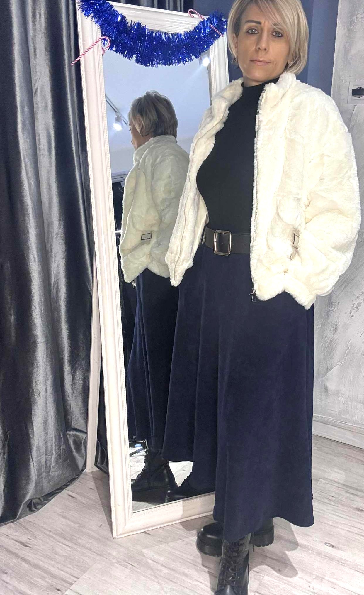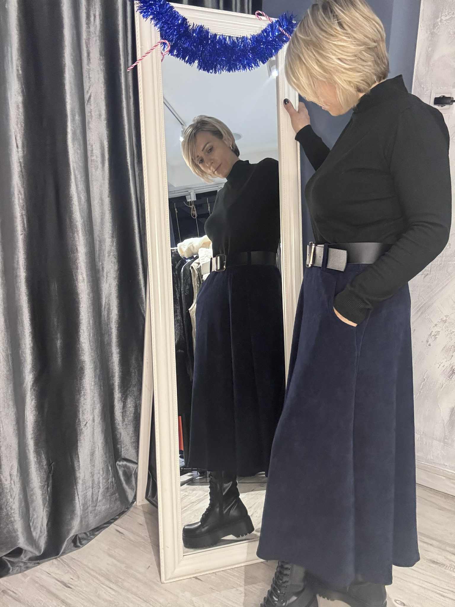 Διαθέτει φαρδιά ζώνη με εντυπωσιακή αγκράφα που τονίζει τη μέση και προσθέτει stylish λεπτομέρεια στο σύνολο. Συνδυάζεται ιδανικά με ζιβάγκο ή πουκάμισο για σύγχρονες καθημερινές εμφανίσεις αλλά και πιο ιδιαίτερες εξόδους.