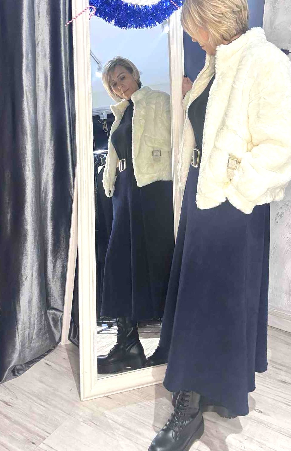 Η υφή της θυμίζει απαλό, βελούδινο ύφασμα και προσφέρει άνεση, ζεστασιά και κομψότητα. Η γραμμή της είναι ελαφρώς Α-line, χαρίζοντας όμορφη κίνηση και κολακευτική σιλουέτα.
