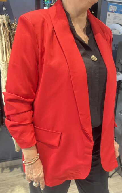 Το highlight του κομματιού είναι η ενσωματωμένη ζώνη-μαντήλι σε γαλάζιες αποχρώσεις, που προσθέτει μια θηλυκή και chic πινελιά. Οι διακριτικές πιέτες στο μπροστινό μέρος και οι λεπτομέρειες με κουμπί στα ρεβέρ ολοκληρώνουν ένα άκρως προσεγμένο design.